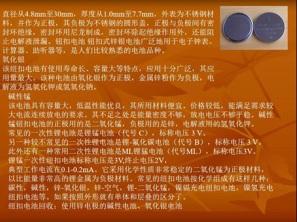 纽扣电池有两种,一种像电脑里面或者汽车遥控器上用的,3伏的,一般是锂锰的电池。还有一种是1.2到1.5伏的,有两种,一种就是锌锰电池,一种是氧化银电池。